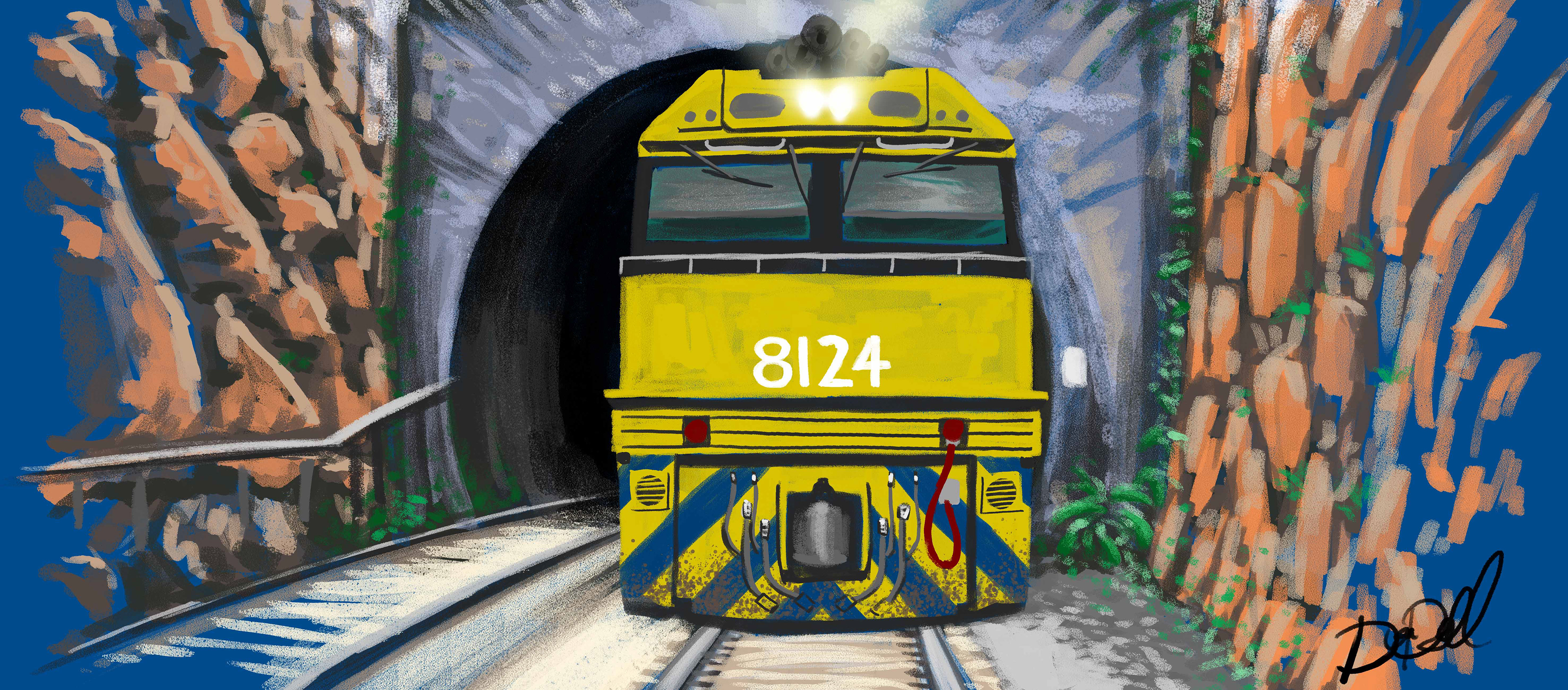 I was tasked to paint this curved wall with a train for this freight company. I first painted a digital painting with a Cintiq and Photoshop before painting the wall with spray paint.